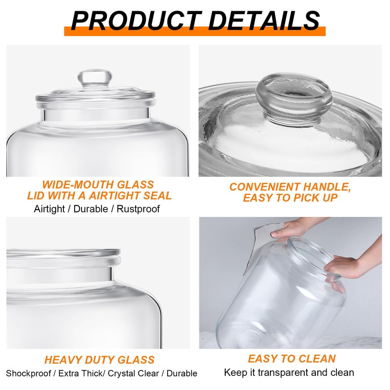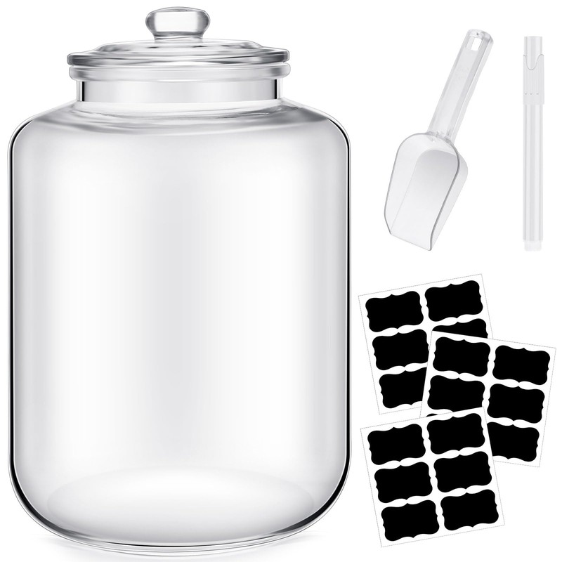 - Versatile Usage: these glass jars with lids offer multi functional usage; With a generous capacity of about 6 gallons, they become suitable for storing cookies, snacks, candy, grain, and more; These gallon glass jars with lids come with an ice shovel, 3 distinctive stickers and a liquid pen, making it easier to organize and identify the items stored in them