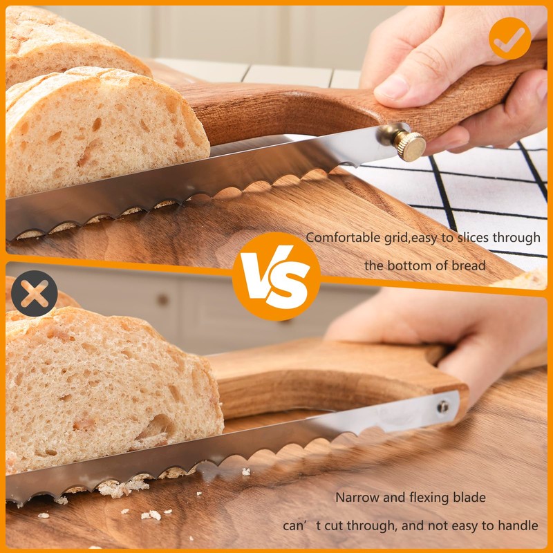 - Our sourdough knife slicer is using upgraded blade, which is different from other bread saw, ours are thicker, wider, sharper with protruding serrated, make sure every slice is clean and even. High-quality stainless steel, will retains its sharpness over time, maintaining precise cutting performance.