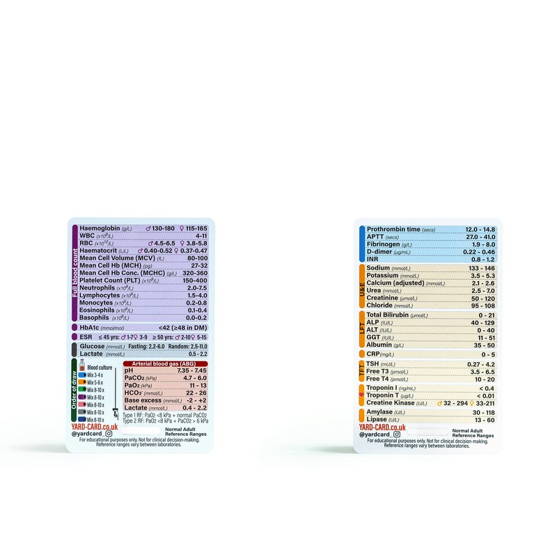 - ? Reference Ranges YardCard: Reference ranges for commonly ordered blood tests (including FBC, U&E, LFT, TFT), as well as interpretation of Arterial Blood Gas (ABG) and Order of Draw. Never feel lost again!