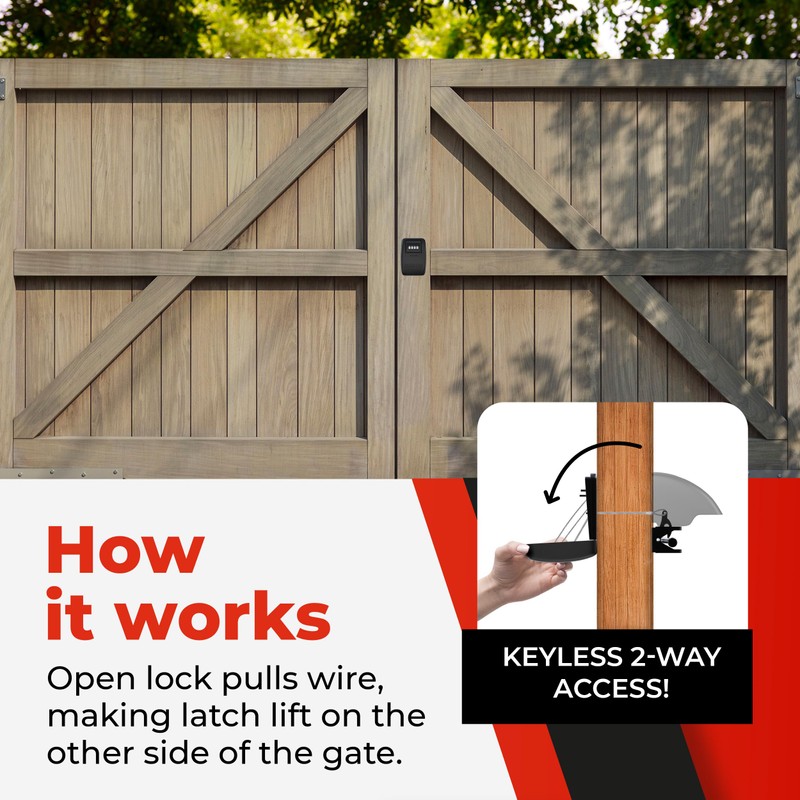 - HOW IT WORKS: Enter your personal 4 digit code to open the lock. A wire going through the post pulls the latch, gate is unlocked. To exit the yard simply push the latch to open the gate. 2 way access.