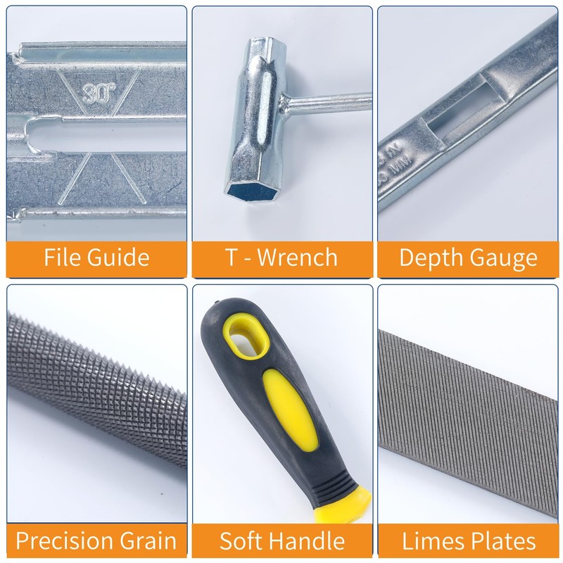 - 【Material】The chainsaw sharpener file kit are made of durable steel, metal and non-slip rubber, each tool has been strictly processed, wear-resistant and rust-resistant, ensuring stability and reliability under long-term use.