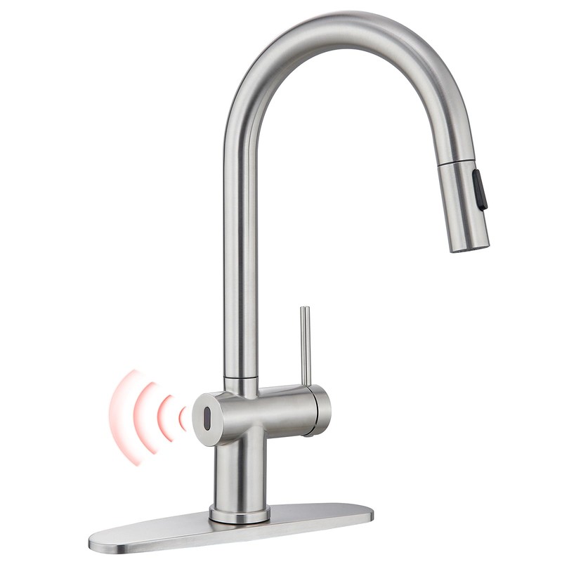 - ADVANCED NON-CONTACT SENSOR SWITCH TECHNOLOGY: Our kitchen sink faucets feature advanced non-contact sensor technology. Once the faucet is turned on, simply bring your hand close to the sensor and water will flow through the sensor system. It's fast and sensitive and stops automatically within 3 minutes to prevent forgetting to turn it off.