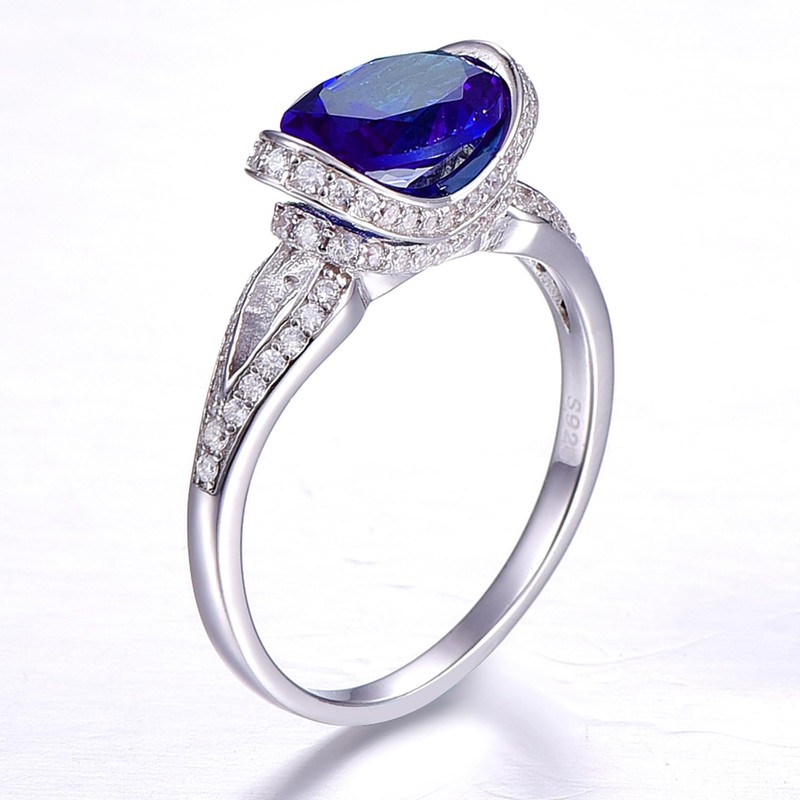 - Oval Cut Sapphire Ring: Made with AAA+ round-shaped shiny cubic zirconia 20PC 1.2mm and 59PC 1mm. The entire oval stone is 7mm x 9mm. It is a bezel setting with one simulated 2-carat oval-shaped blue sapphire. The band shank measures 2mm in width. Zirconia and sterling silver plated to great clarity and sparkle.