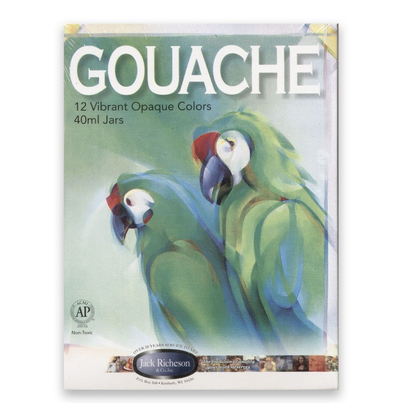 Set contains 12 - 40 ml plastic jars of creamy, vibrant, non-transparent colors: zinc white, yellow light, ochre light, vermilion, alizarin crimson, iron oxide, Prussian blue, emerald light, violet deep, green deep, mars brown, and carbon black. ACMI non-toxic.