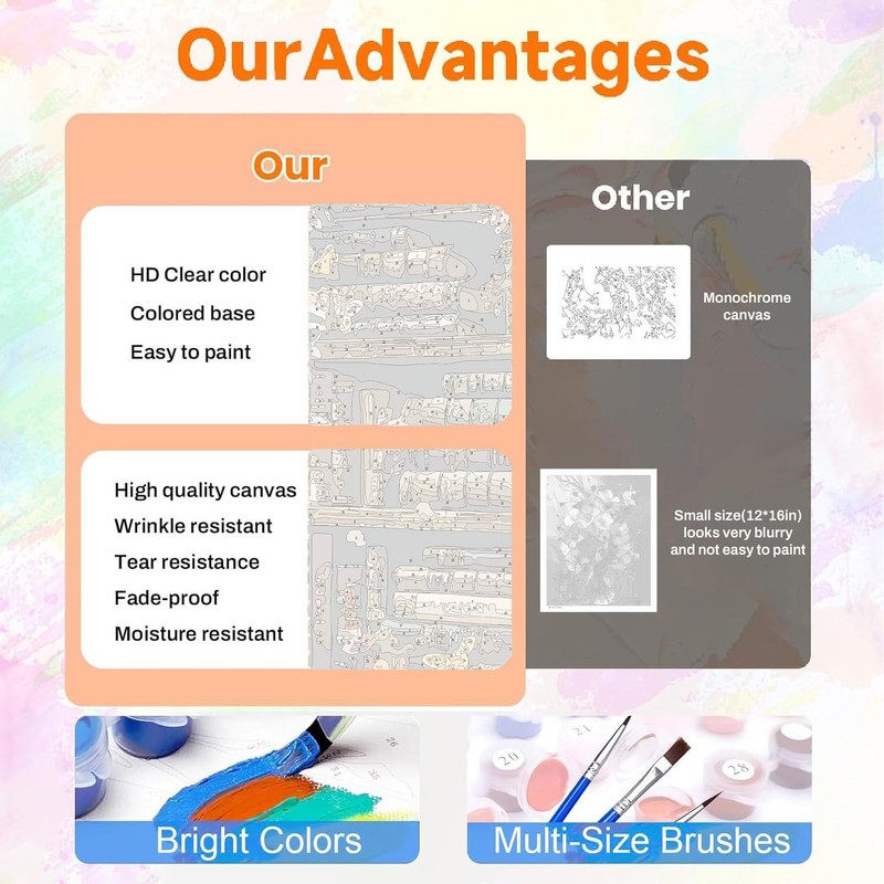 - 【Professional canvas and high quality brushes】Paint by numbers uses a colorful high-definition canvas, which makes it easier to distinguish the numbers area, and the eyes are not easy to fatigue when painting for a long time. Please don't worry. High-quality brushes of different sizes are not easy to shed or split. It can provide you with more detailed help to create more vivid and realistic works.