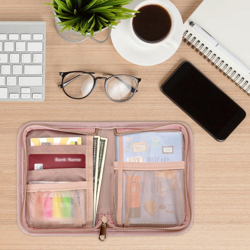 - Main compartment: zip pocket on the right side for notebook, with bookmark strap for marking pages. The other side has 3 pockets for cash, passport, credit cards, etc. The side sleeve keeps pages in place while writing.