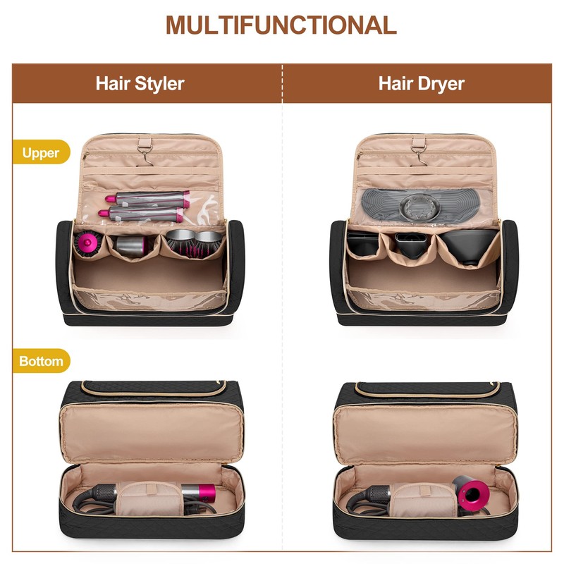 - DOUBLE LAYER - Top main compartment with 2 small and 1 large well-padded slots to organize your accessories, like coanda smoothing dryer, firm smoothing brush, soft smoothing brush, round volumising brush, pre-styling dryer. The bottom with wide magic strap to keep airwrap styler in place and ensure security.