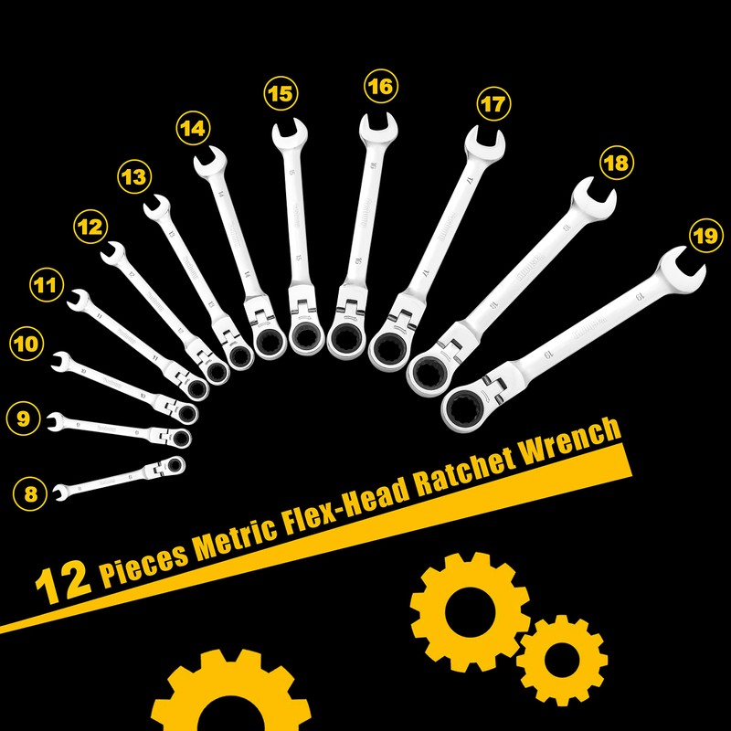 Yashong 12-Piece 8-19mm Metric Flex-Head Ratcheting Wrench Set, Professional Chrome Vanadium Steel Ratchet Wrenches, Combination Ended Spanner Kit with Portable Suspended Canvas Bag