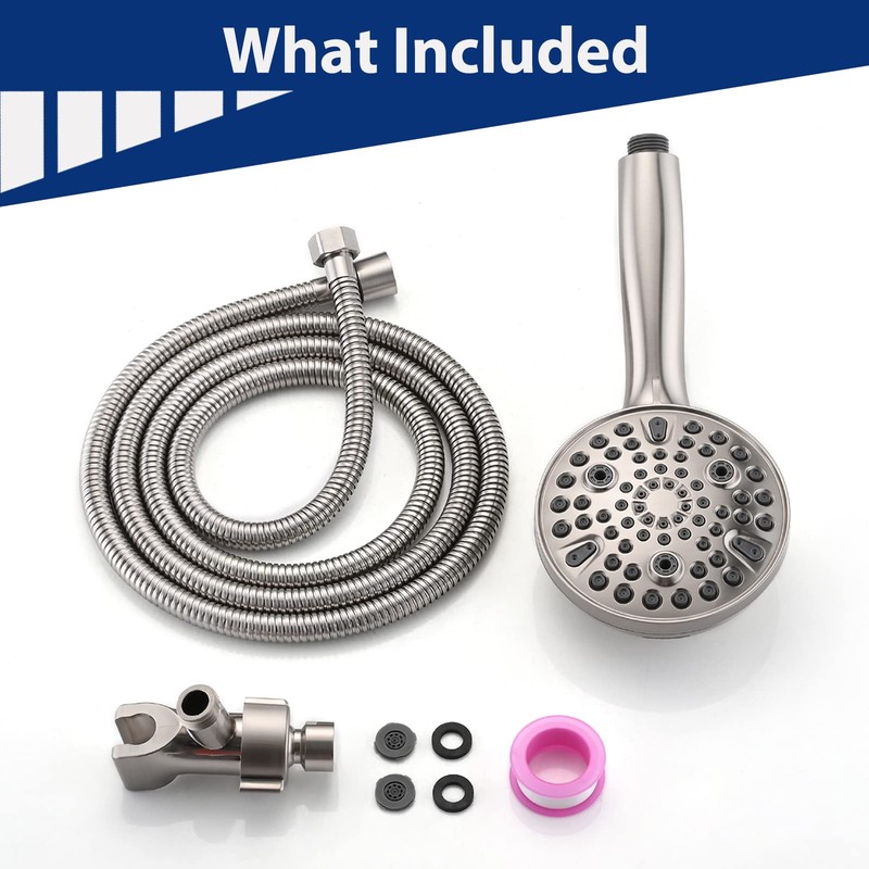 - Included: 5 inch Dia handheld shower head, 304 stainless steel hose, 360° rotatable bracket with brass ball joint, user manual, anti-leakage teflon tape and rubber washers