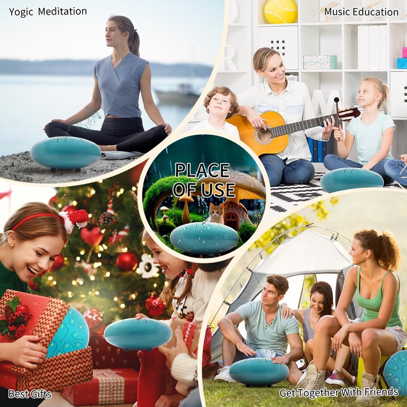 - Applicable SceneThe hand pan drum can be used for yoga meditation, prenatal education, music education and music therapy, etc. The sound is ethereal, and the beautiful sound echoes in the air, which is longer than the echo of other musical instruments, allowing you to have a kind of relaxation and pleasure from the heart.