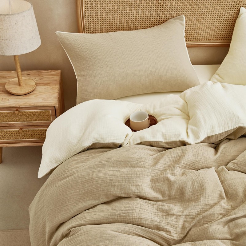 - Box contents: 1 duvet cover 135 x 200 cm + 1 pillowcase 80 x 80 cm (duvet cover and pillowcase are with zip). The other side of the bedding is light beige, so you can choose the colour you like. The double muslin bed linen with cloud feeling is the perfect gift for children, family and friends.