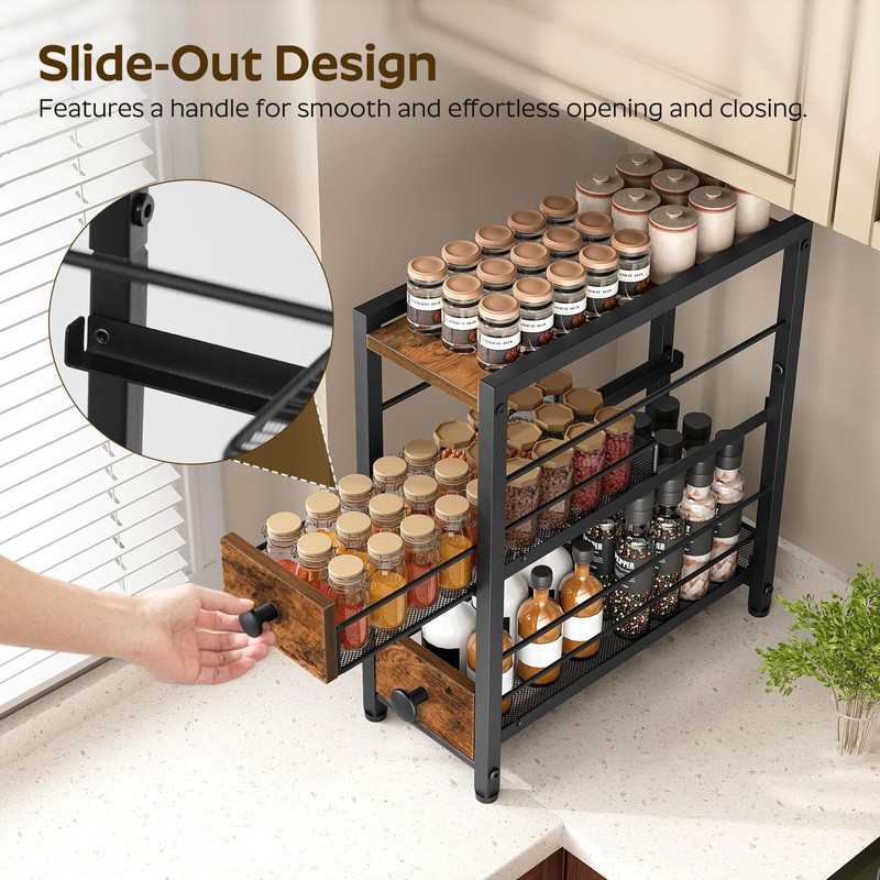 - Three-Tier Layout: The spice rack has a top and two smooth drawers, perfect for organizing messy spice bottles on the counter. Pull-out design eases item access; locking mechanism stops drawers from fully opening and items falling out