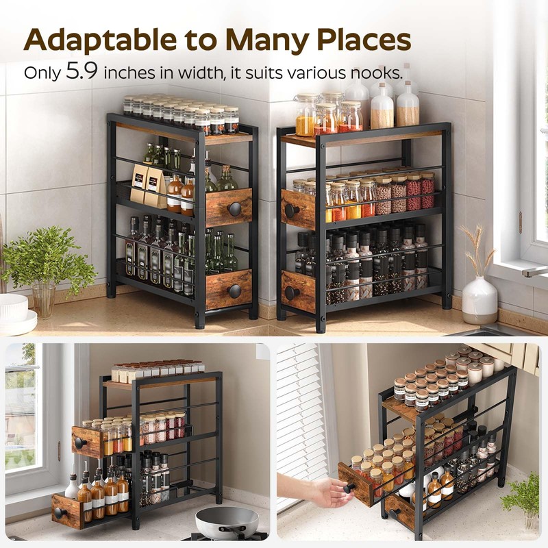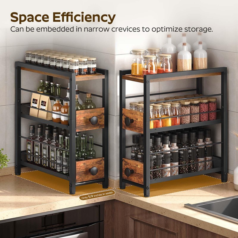 YATINEY YATINEY Spice Rack, 3-Tier Pull Out Spice Rack Organizer for Countertop, Narrow Spinning Organizer with 2 Drawers, for Kitchen, Cafe, Rustic Brown and Black SR02BR