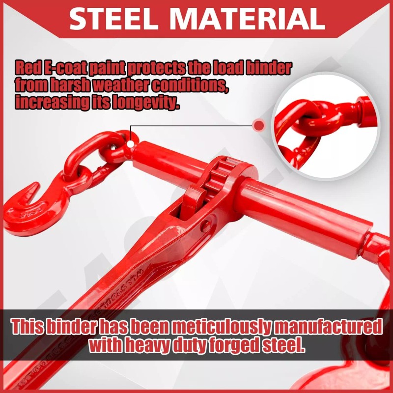 đăDURABLE AND SAFEăMade of durable materials. Red-coated housing extends this chain binderâs durability and lifespan. The ratchet is able to control the chain easily. Get the correct tension on the chain, then safely tighten the cargoes.
