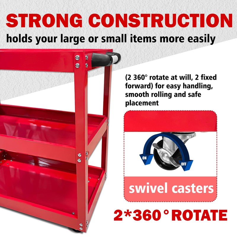 • 🛠️【Three Layers Practical Shelves】Easy to transport supplies, tools and goods; Each shelf has a deep basin style to help store items safely and stably.