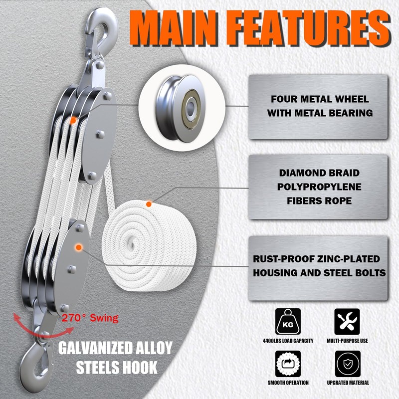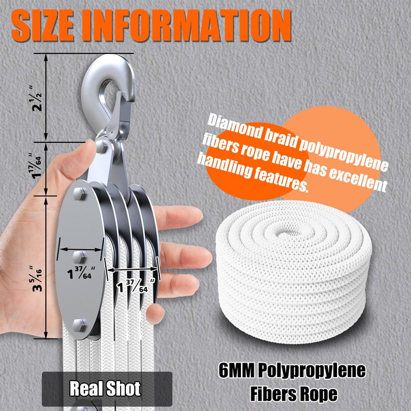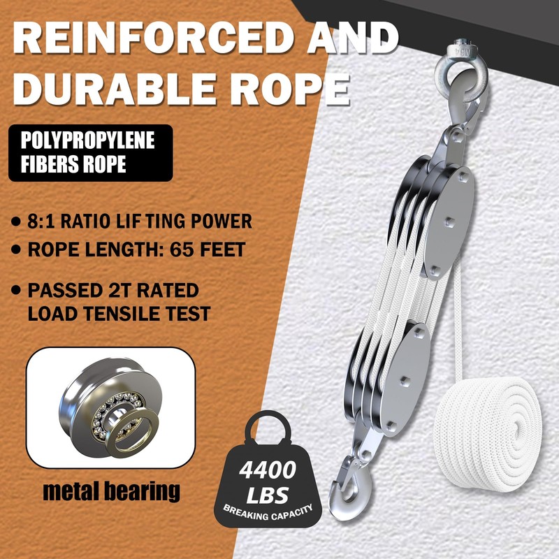 - 4400LBS CAPACITY:This block and tackle pulley system assed 1.25 times the rated load tensile test and 2T rated load tensile test, and made of durable pulley and poly rope with 4400 lbs breaking strength for sturdy and smooth operation; You can lift both heavy and light stuff with this heavy-duty pulley