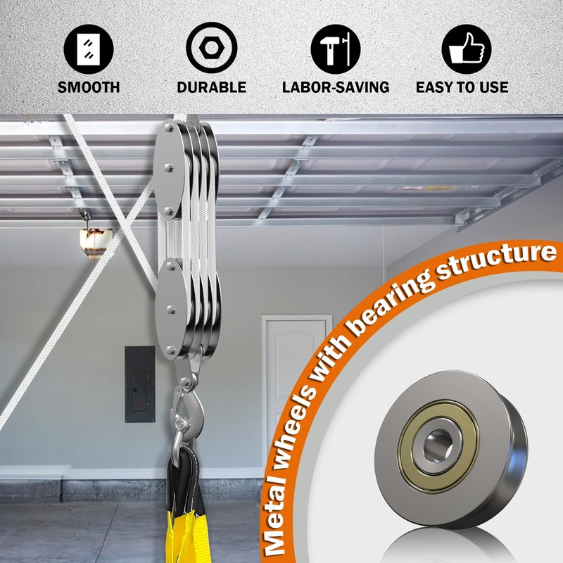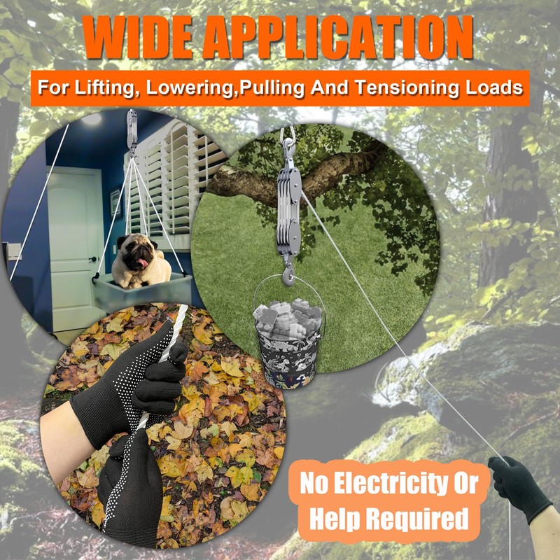 - Wide application:Heavy-duty rope pulley hoist is suitable for hunting, boating, lifting, garage, pets, tree cutting, didactic, and many more uses; And both sportsmen and people with disabilities or back problems