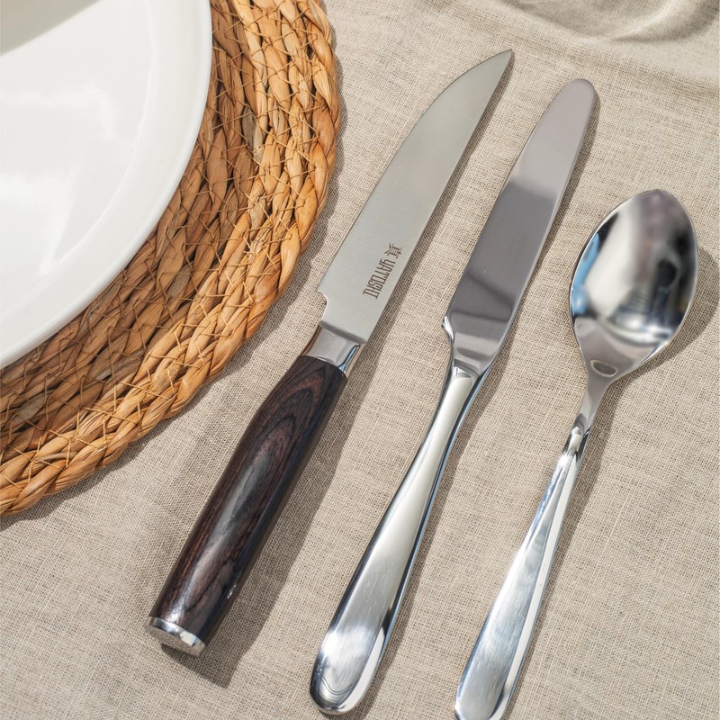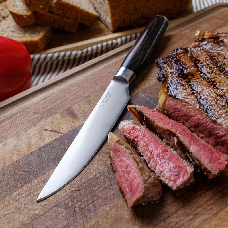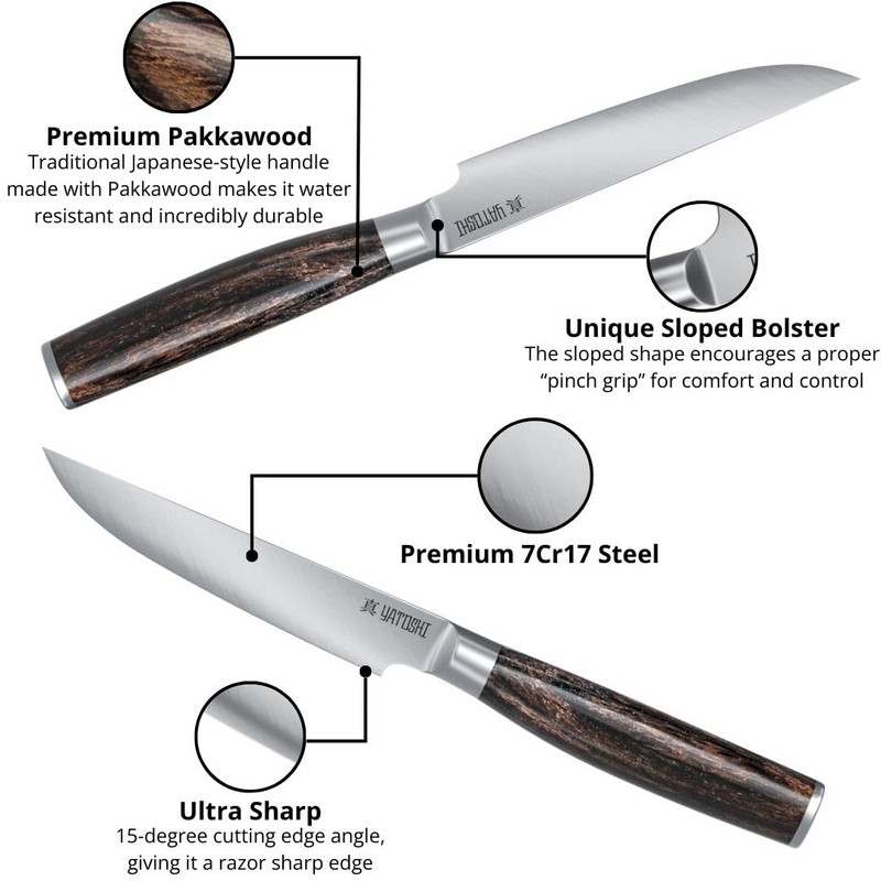 - High-Carbon Blades: Made with premium 7Cr17 High-Carbon Steel, which provides a razor-sharp, professional-quality blade. The steel contains 0.6-0.75 carbon, making it two times tougher than other knives in its class with a Rockwell Hardness of 57-58.