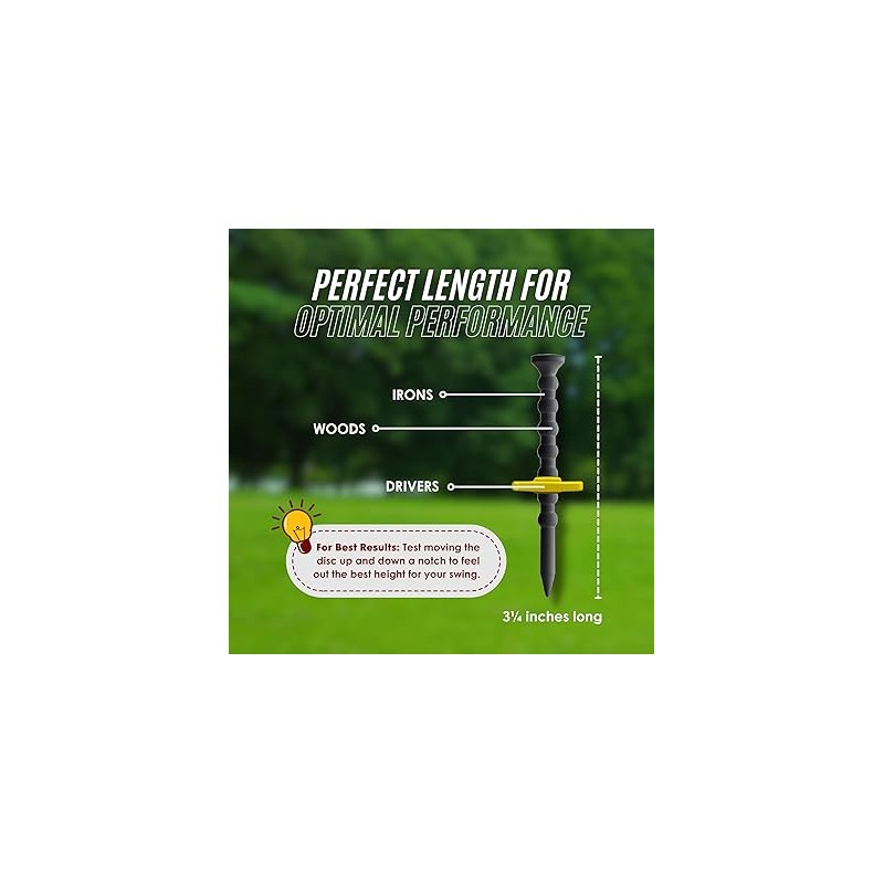 • NEVER LOSE A TEE AGAIN – The disc used for height adjustability also doubles to keep the golf tee in the ground when you swing so you never misplace it. Depending on the tee box conditions and your swing, the golf tee may still come out on occasion, but the high-contrast colors make the tee extremely visible and virtually impossible to lose.