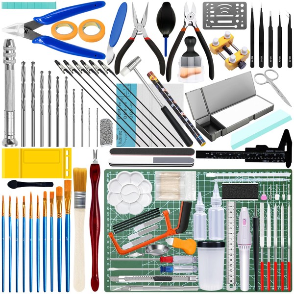 - [108Pcs Model Kit] The model building tools kit contains 2pc craft knife with 5pcs blades, 3pcs model nippers, cut mat, 3pcs model separator, 6pcs polisher set, 3pcs mask tapes, sticker box, 6pcs clips, glue applicator & remover and 3pcs bottles, 5pcs tweezers, 11pcs hand drill set, finger cots, hammer, sculpture pen, scissors, bench vise, stencil, 10pcs paint brushes & cleaner, fluid ruling pens, weathering & cleaning brush, clay, air blower, 4pcs saw frame set, 4pcs sandpapers, 8pcs glass & metal files, 2pcs paint tray, swab,wax pencil, 4pcs sand sticks, 2pcs ruler, 2pcs screwdrivers.