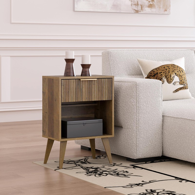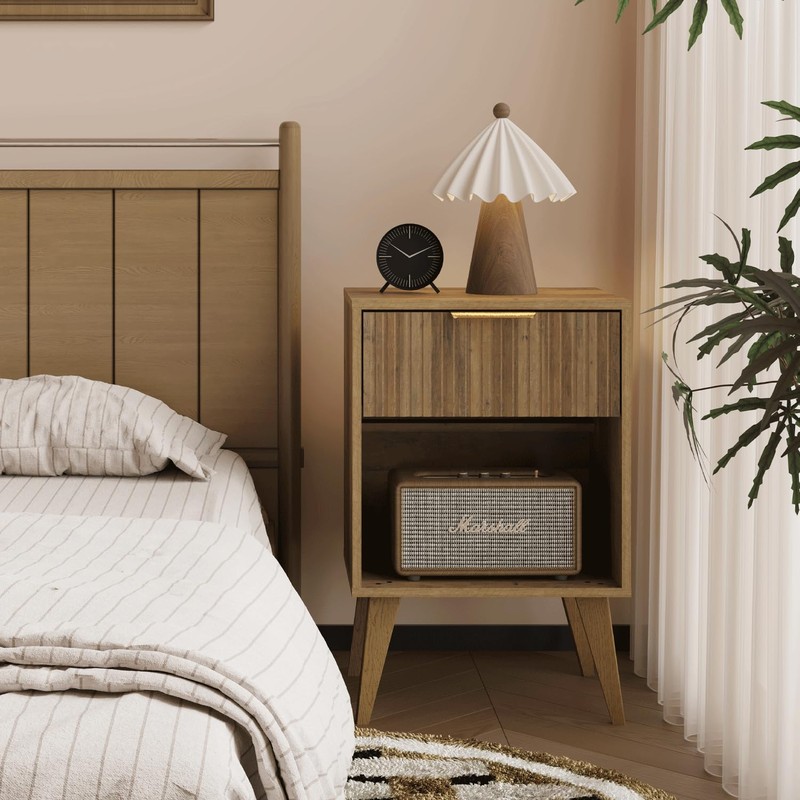 YAUKOMEL Fluted Night Stand with Opening Storage,Mid Century Bedside Table with Drawer,Wood Nightstand with Solid Wood Legs,End Table Side Table for Living Room,Bedroom,Caramel Oak CTG56BR