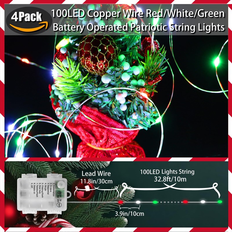Yayfazy Christmas Lights Indoor Battery Operated, Red White Green Mini Copper Fairy Lights with Auto Timer, 4PACK Total 400LED 131.2Ft 8 Mode Lights for Bedroom, Christmas Tree, Table