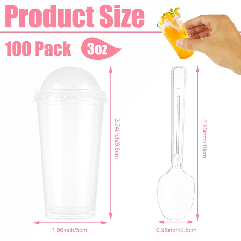 - 【Package Include】Package includes 100pcs 3 oz small dessert cups with 100pcs clear tasting spoons and lids. Each cup measures 1.96 inches top Dia x 3.74 inches high, Spoon measures 3.93" length, perfect catering supplies for parties, events, restaurants and more
