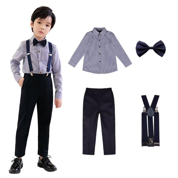 • Important: This product is small, so muscular boys should choose one size larger than usual. Product Composition: Wine shirt, bow tie, suspenders and pants. A classic children's suit that is easy to wear and very cool