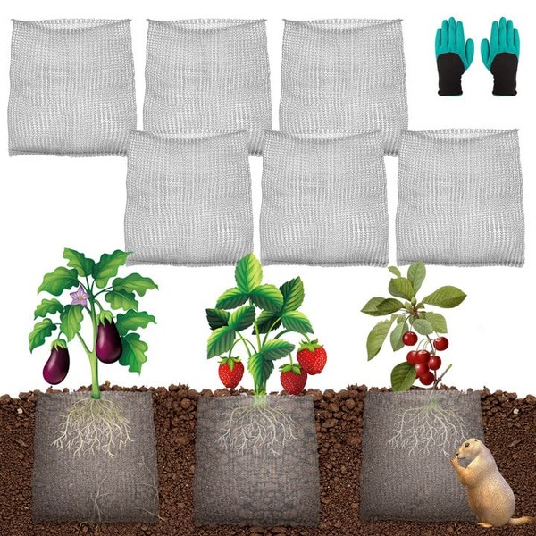 YBB 6PCS Root Guard Baskets, Gopher Wire Speed Baskets, Stainless Steel Mole and Vole Baskets for Garden Plant Root Protection with Gloves (1 Gallon)