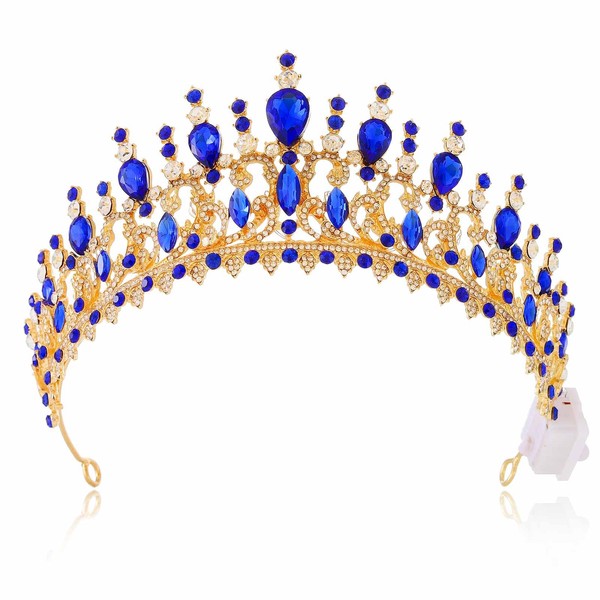 YBSHIN Light Up Gold Rhinestones Queen Crowns, Bridal Wedding Fantasy Crystal Tiaras, Pageant Prom Hair Pieces for Women (Blue)