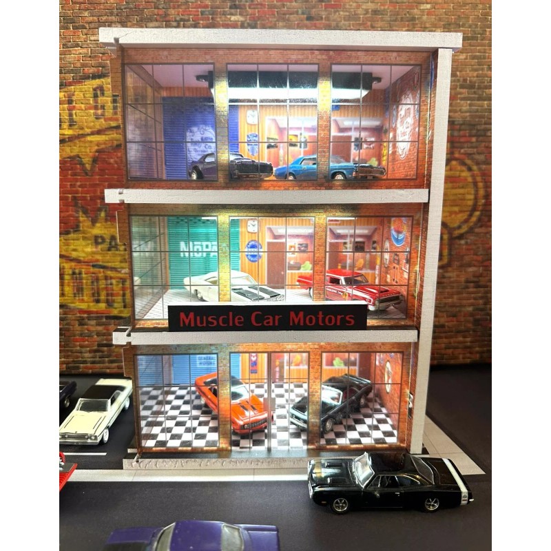 This is a fantasy dealer who buys a 3 story building in Anytown USA and decided to dedicate each floor to a brand of American muscle cars. GM, Mopar and Ford specifically. Each floor is highlighted by those brands memorabilia. Each floor also has its own working ceiling light which does need an USB adapter plug to use with standard wall plugs but not included.