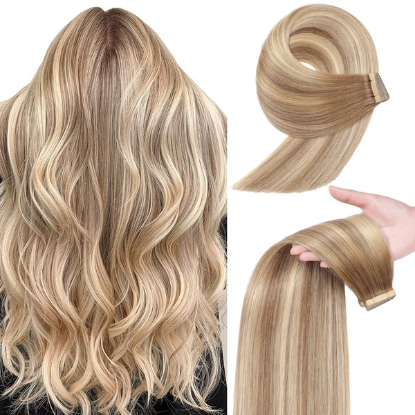 YDDM Balayage Gold Brown Mixed Dark Blonde Tape in Hair Extensions Human Hair 16 Inch 20pcs 100% Remy Human Hair Straight Seamless Invisible Tape in Hair Extensions(10/10/22#, 16 Inch)