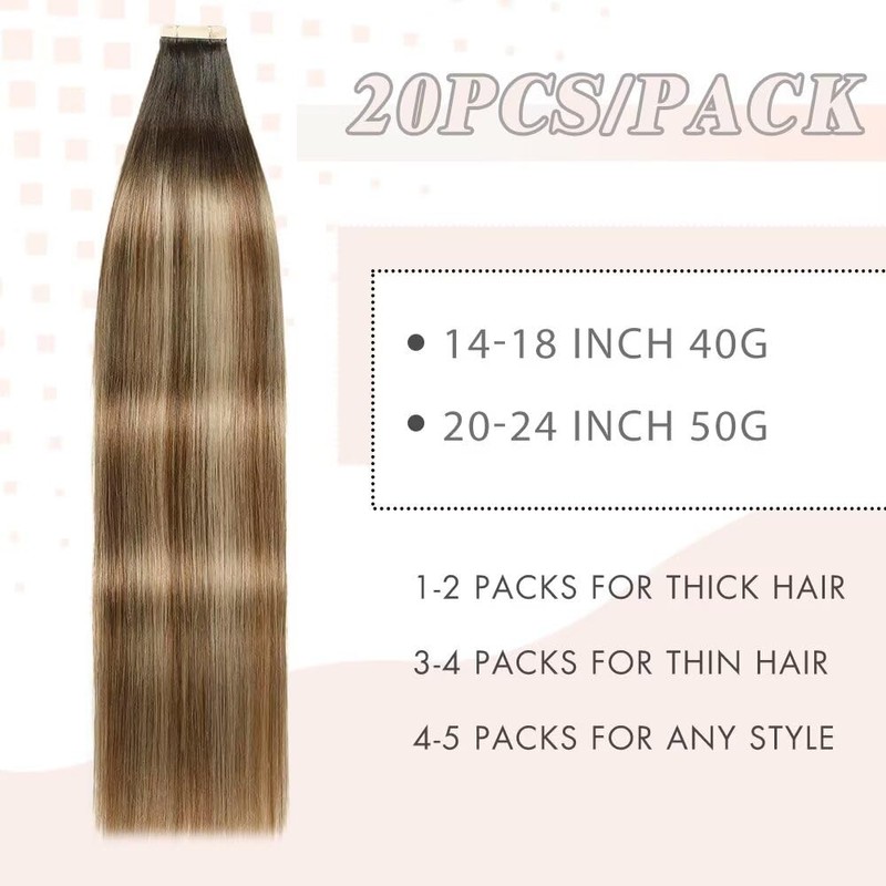 YDDM Tape-In Real Hair Extensions, 20 Pieces, 55 cm, 50 g, Chestnut Brown to Light Brown with Light Blonde, Invisible Tape Extensions, Real Hair Extensions (22 Inches, 2/6/18 K#)