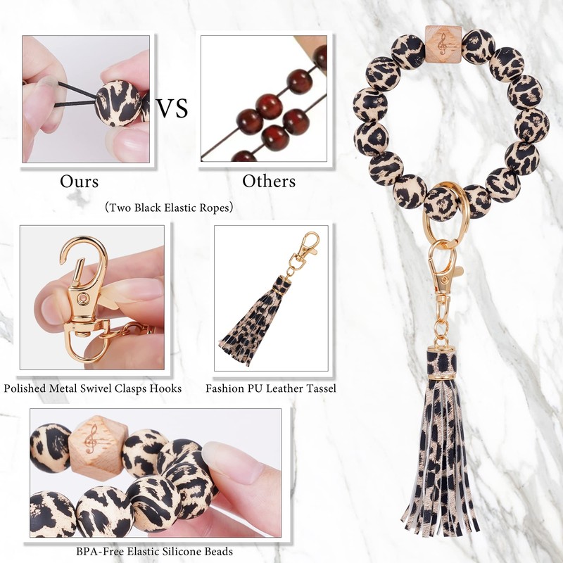 - [HIGH QUALITY COMBINATION] The keychain bracelet circle is made of Superior, BPA-free food-grade elastic silicone beads and 1 natural wood bead. Equipped with detachable high-quality leather tassels and golden polished alloy keyring holder. The overall look is stylish and elegant. It even adds a chic flair to your OOTD
