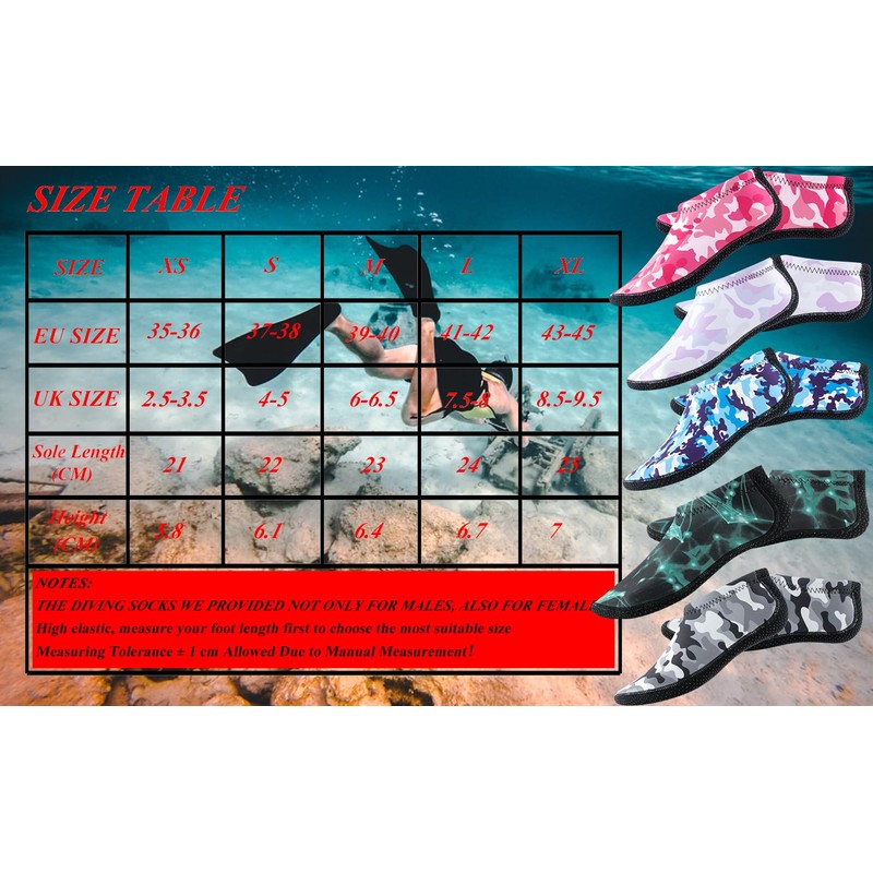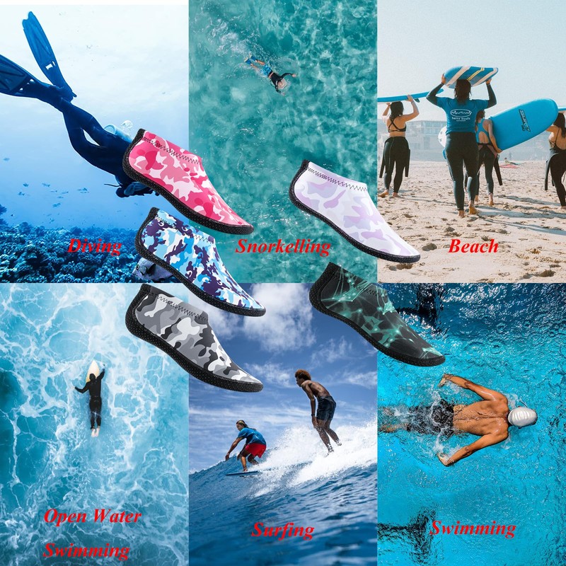 - MULTI-USE: Versatile camouflage beach socks are great for open water swimming, snorkelling, scuba diving, spearfishing, surfing, sailing, kayaking, canoeing, boating, wading, yoga, pilates and other sports. Note: The bonding and blind stitching process of neoprene socks slows down the rate at which water seeps through the socks and increases their durability. Diving socks are not a completely waterproof product. Water will inevitably seep through the seams inch by inch.