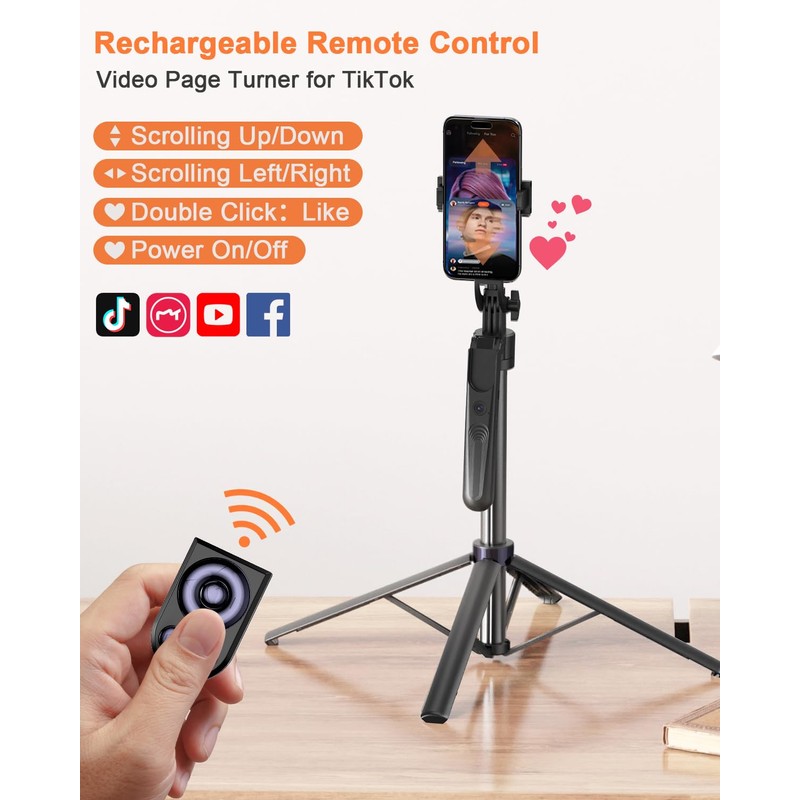 - Remote Control for TikTok Video Recording The phone stand with light comes with a rechargeable Bluetooth remote control, allowing you to easily manage TikTok from afar without needing to swipe on your screen. Whether scrolling up/down, swiping left/right, or double-tapping to like, you can effortlessly perform all actions with just a click, making your video shooting and viewing experience much smoother and more convenient