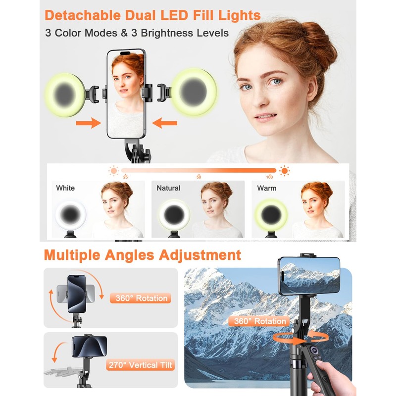 - Multi-Angle Adjustment and Wide Compatibility This phone tripod with light offers versatile 360 rotating head, 270 tilt angle, and a 360 balanced handle, allowing you to effortlessly find the ideal shooting angle. Additionally, the integrated 1/4" screw supports cameras, GoPros, and ring lights, while the flexible phone holder accommodates devices with screen sizes from 4.7 to 7 inches, ensuring seamless compatibility with both iPhone and Android devices
