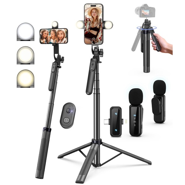 - Complete Vlogging KitThis vlogging kit is designed specifically for content creators on platforms such as TikTok and YouTube. The complete starter kit combines a selfie stick tripod, dual fill lights, a wireless mic, and a smart remoteprofessional essentials for vlogging, live streaming, interviews, and social media videos. As a one-stop mobile studio kit, it helps you effortlessly launch high-quality creationshoot anywhere.