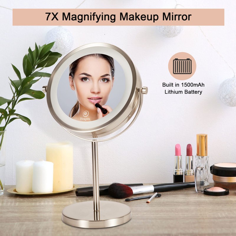 Yeapro 1x/7x Lighted Makeup Mirror 8" Double Sided Round Makeup Mirror with Bottom Touch Button, Standing 360 Degree Rotation Cordless and Rechargeable Makeup Mirror with Lights and Magnification,Luo