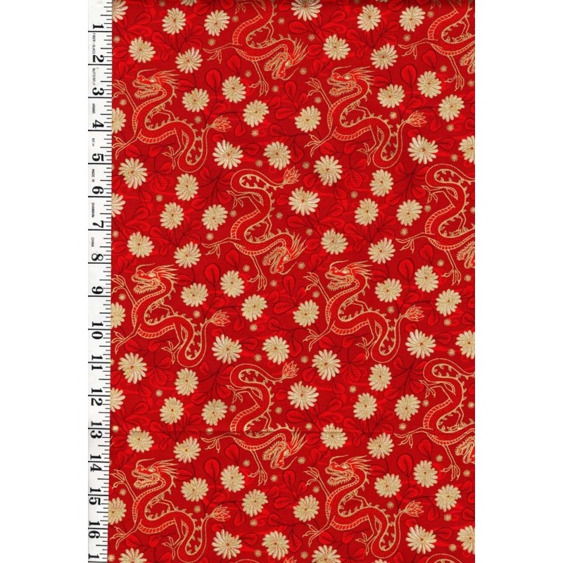 From The Year of the Dragon collection, this fabric features dragons and small floating mums with gold metallic accents.