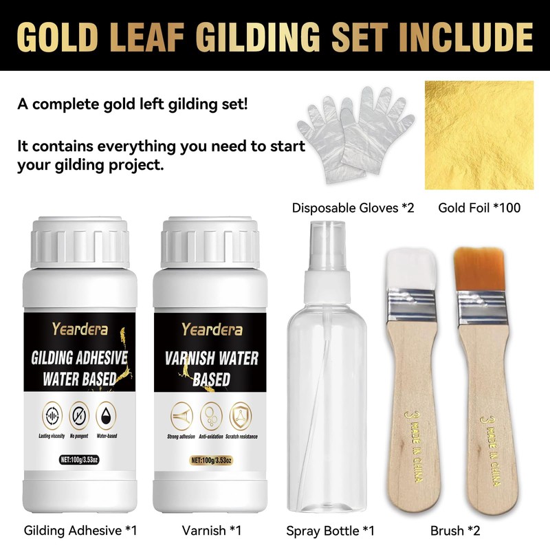 Yeardera Gold Leaf Kit, 100ml Gilding Adhesive and Varnish with 100 Gold Leaf Sheets for Arts, Crafts, Painting, Furniture, and Decoration