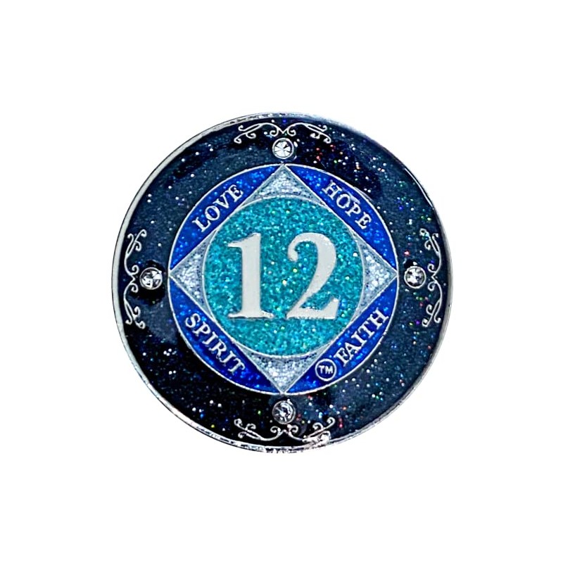 (Years 1-50) NA 12 Year Crystals and Glitter Medallion, Silver Color Plated Coin, Black Rainbow, Blue Glitter and Four Clear Crystals, Epoxy Covered (NA 12 Year Glitter & Crystals Medallion)