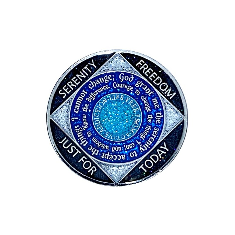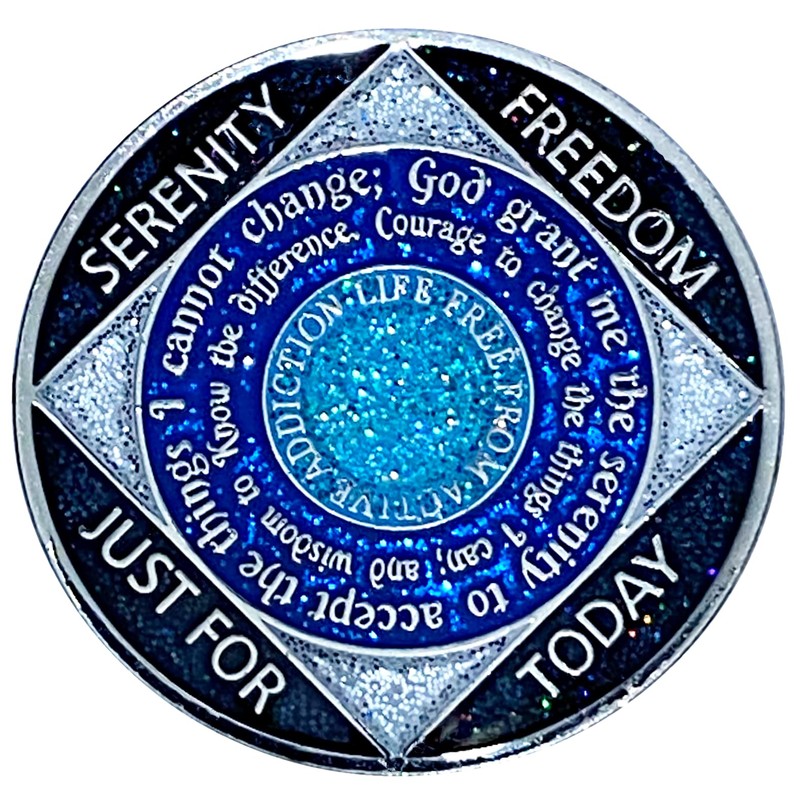 (Years 1-50) NA 12 Year Crystals and Glitter Medallion, Silver Color Plated Coin, Black Rainbow, Blue Glitter and Four Clear Crystals, Epoxy Covered (NA 12 Year Glitter & Crystals Medallion)