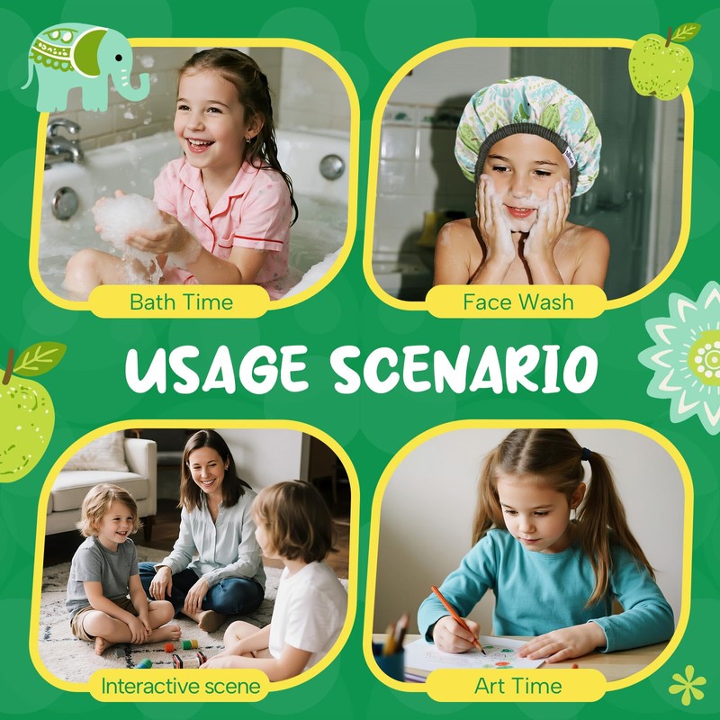 • Reversible & Fun To Wear:Playful cartoon shower cap prints like Joy Elephant on one side and a solid color on the other. Flip anytime—two looks in one kids shower cap reusable waterproof, making kids bath routines more fun