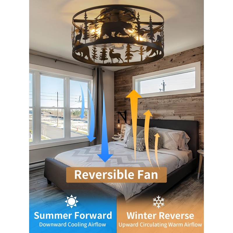 YEDAORL Farmhouse Caged Ceiling Fans with Lights and Remote Control,Rustic Black Chandelier Fan with Bear Deer Design,Flush Mount Low Profile Fandelier for Bedroom,Dining Living Room,Foyer