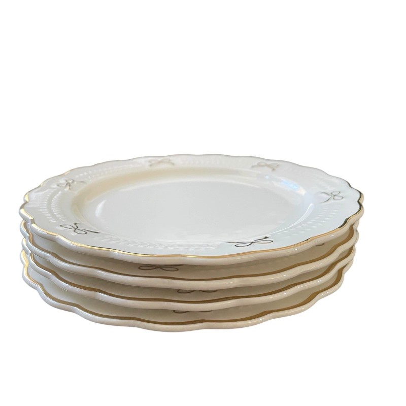 Yedi GOLD BOW Side Plates Set of 4 Ceramic 8in Holiday Glam White
