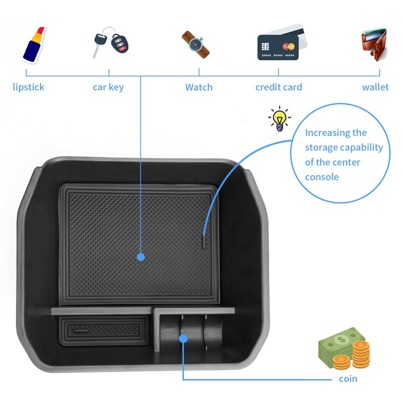 - Smart and beautiful design that increases the storage capacity of the center console. Organize small items such as phones, wallets, sunglasses, change, business cars and so on.