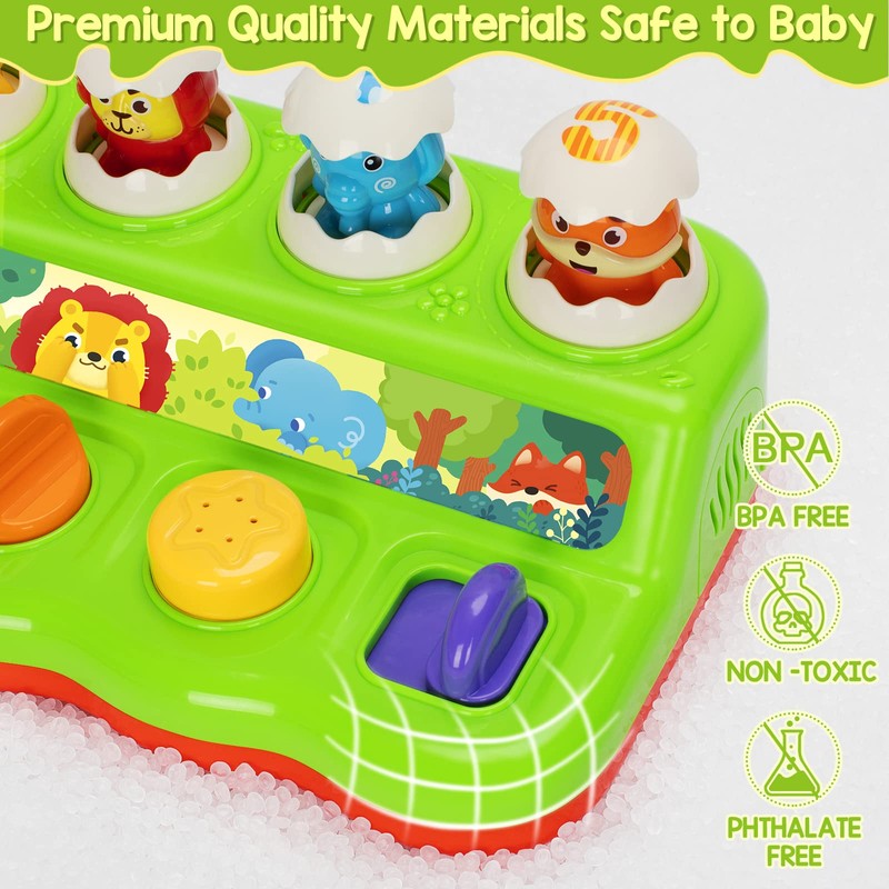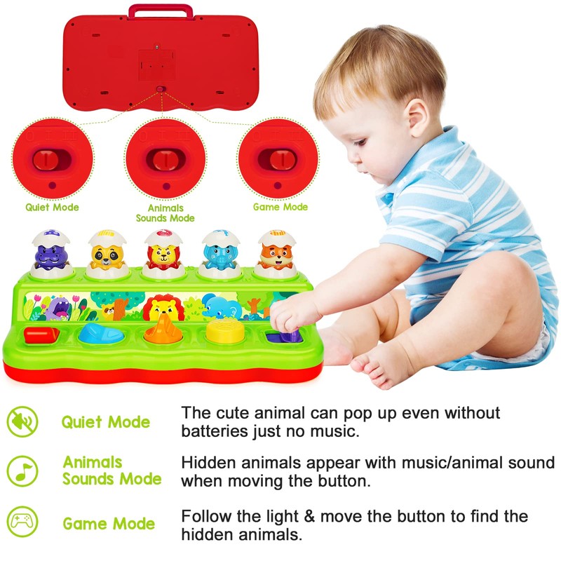 - NEW pop-up toys - Not just Pop up! The Interactive Pop-Up Animals toy includes two different play modes. Animal Sound/Music Mode: When the animal pops up, it will play the relevant animal sound or music. Game/Music&Light Mode: Pup up the correct animal, when the light stops.Note: Batteries not included!