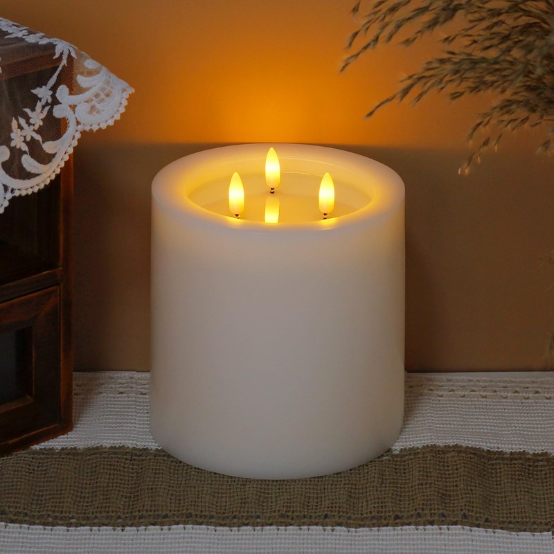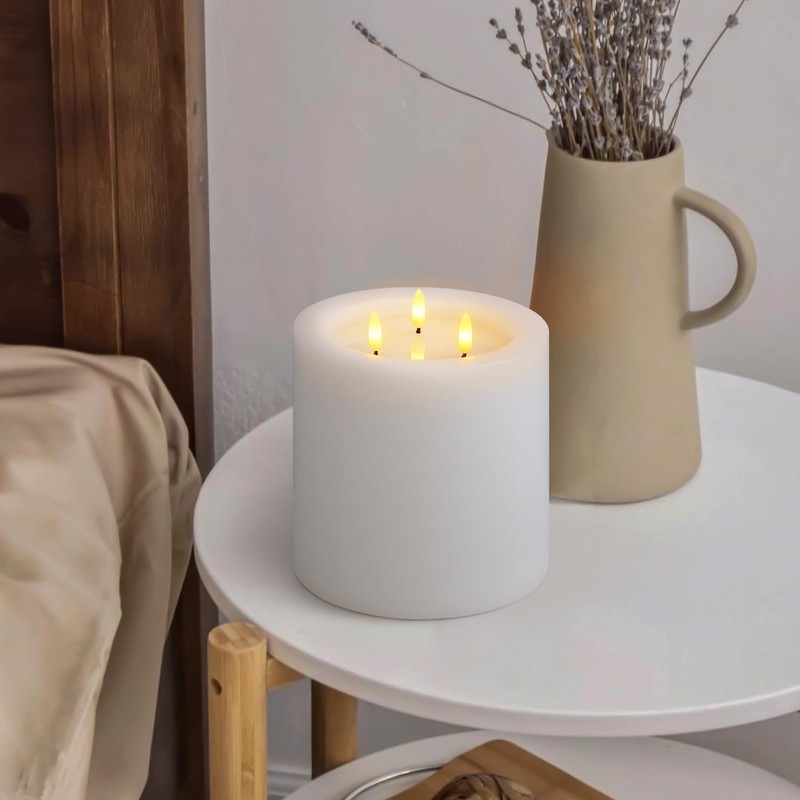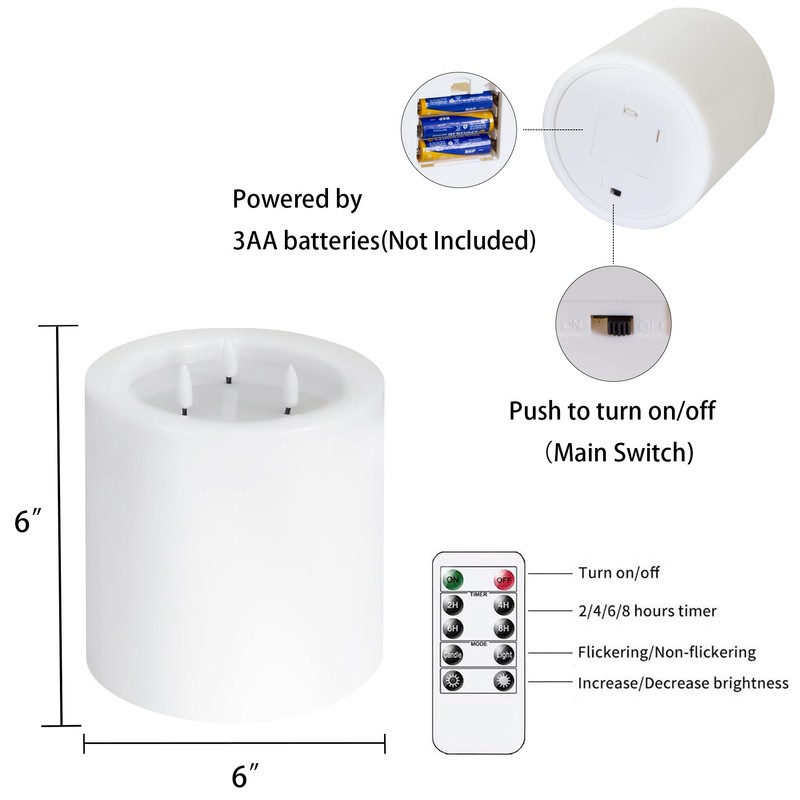 - 6”x 6” 3-Wick LED Candles: You will receive a 6x6 inch white flameless pillar candle, a remote control and an instruction manual. Large size flameless candles are easier to use as decorations for living rooms and bedrooms.