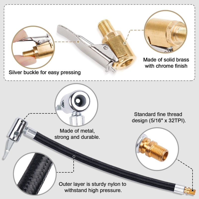 - Structure: Portable tyre filler hose adapter with American standard fine thread design (5/16 inch x 32 TPI). Inflator pump hose can quickly connect and disconnect the tyre mouth, ensuring that the air pressure in the tyre does not leak when the tyre is inflated and disconnected.